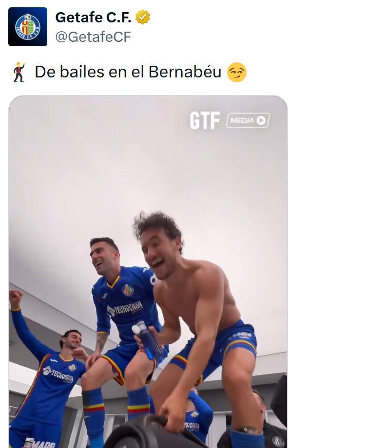 此外赫塔费官媒还发布了球员们在伯纳乌胜利庆祝的画面,并配文写道:“在伯纳乌起舞(De bailes en el Bernabéu)。”(在西班牙体育报道中,dar un baile作为一个较为口语化的表达也常用来形容“把对手打得团团转”,意思是在体育或竞技场合,以较大优势击败对手)