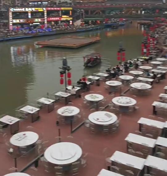 桥下一排都是餐厅饭店,很多游客都在吃宵夜,这些位置一边吃一边看演出,博主就带着孩子们去了。